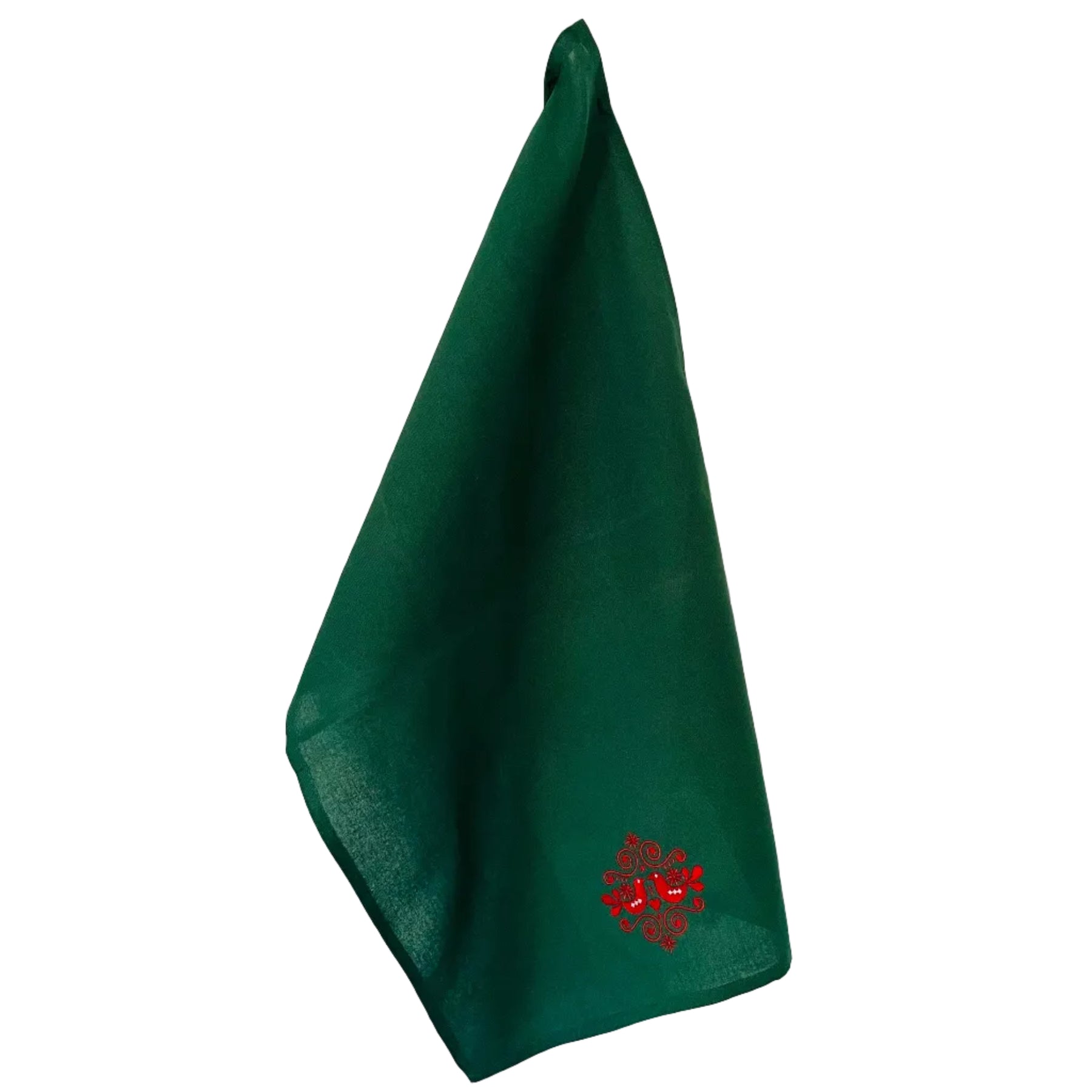 Cotton dishtowel with embroidered design. Size is 16" x 25" and it has a loop for hanging.
