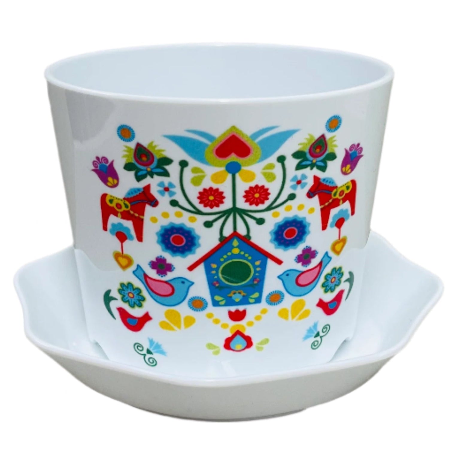 Flower pot. Great designs to liven up your window sill. Two piece polymer plastic set. The pot has drain holes in the bottom and a saucer to catch the excess water. The pot measures 3 5/8" wide x 3" high. The saucer measures 4 5/8" wide x 3/4" deep.