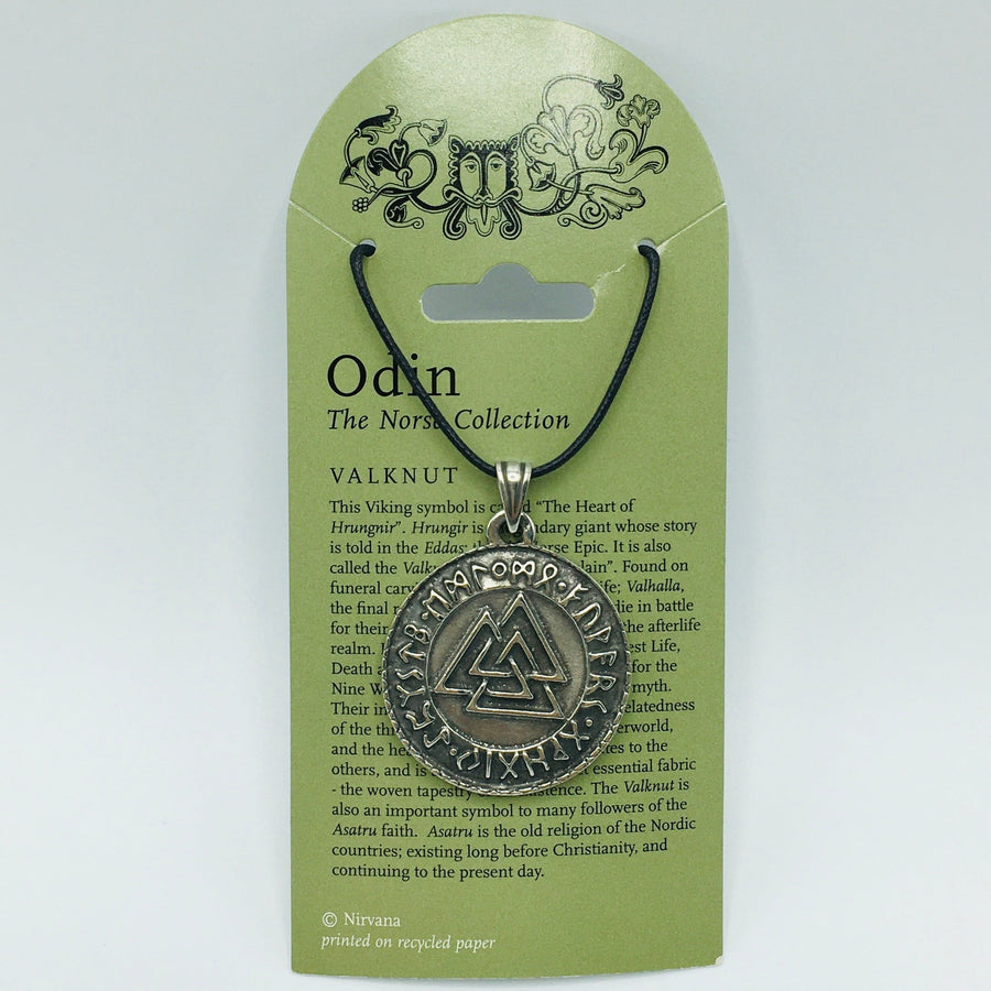 Pewter Valknut. Measures 1 3/4" high x 1 1/4" wide and comes on a 33" long black cord.