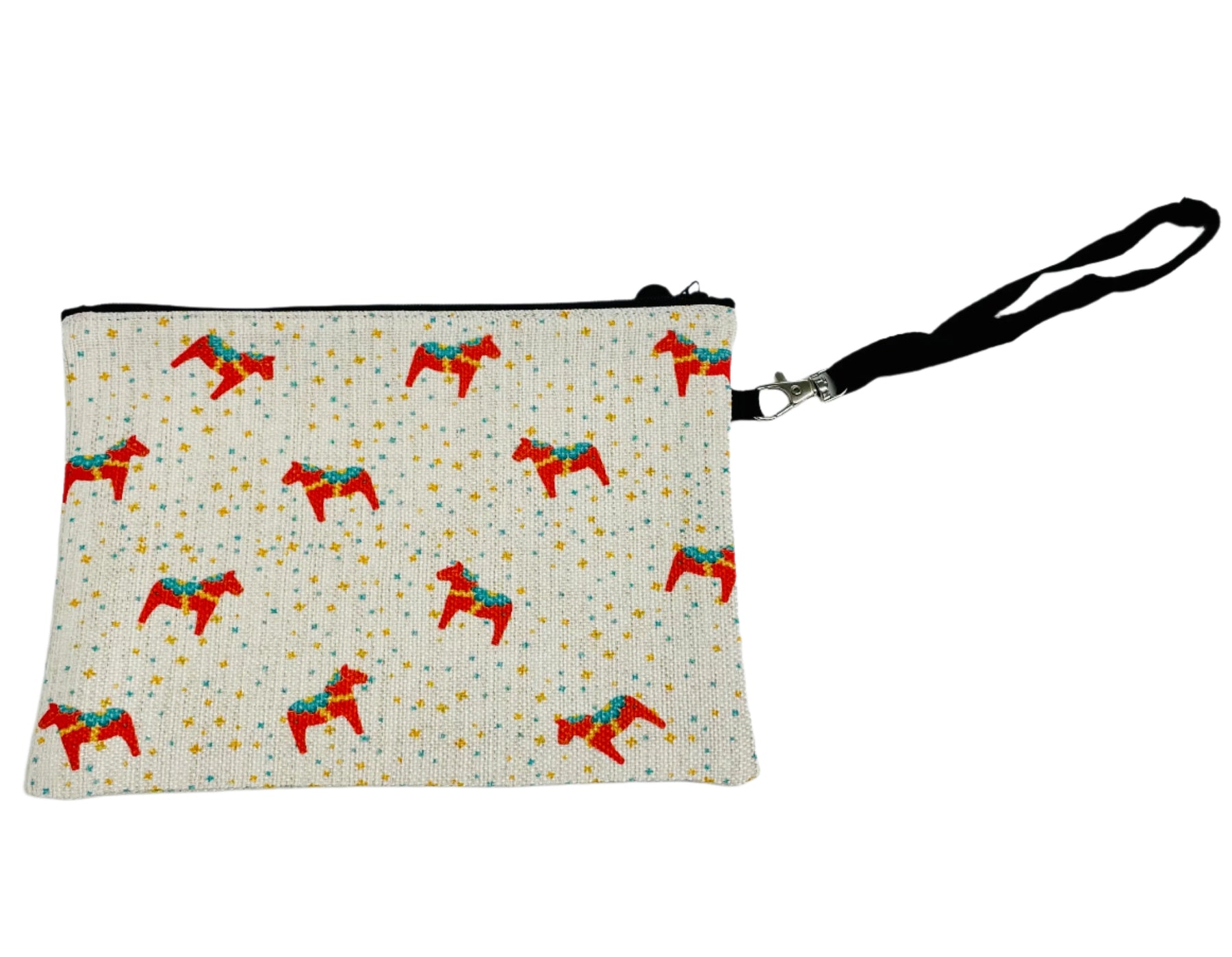 Great bag for cosmetics or use the included wrist strand carry as a small clutch bag. Measures 6.5" x 9.5". Made from poly linen. Printed in the USA. Design is printed on one side.