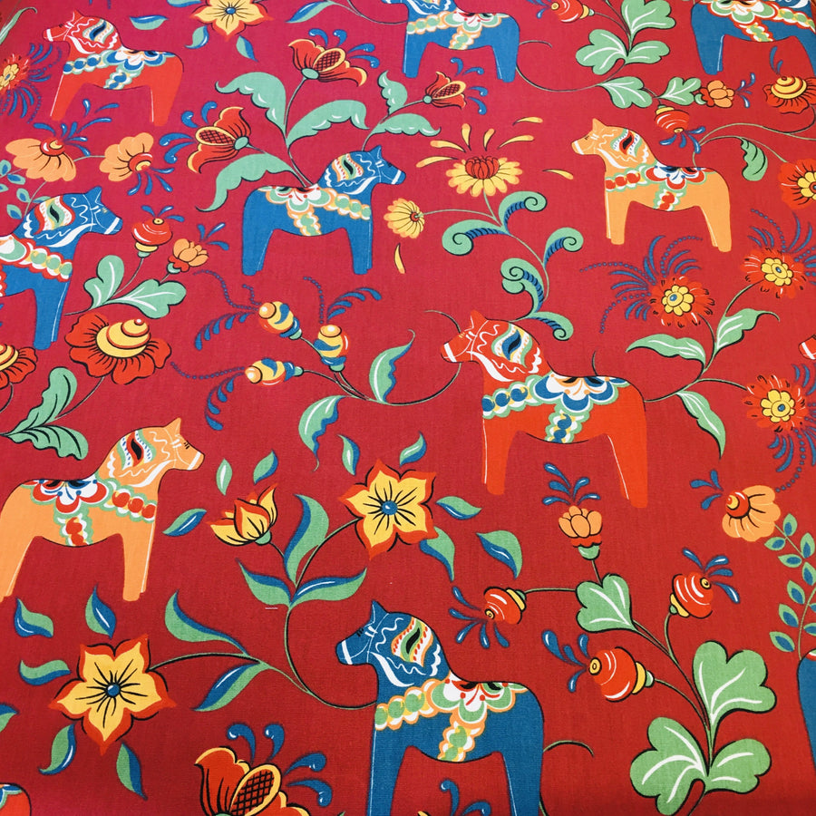 Swedish fabric - Red w/ multi color Dala horses & kurbits