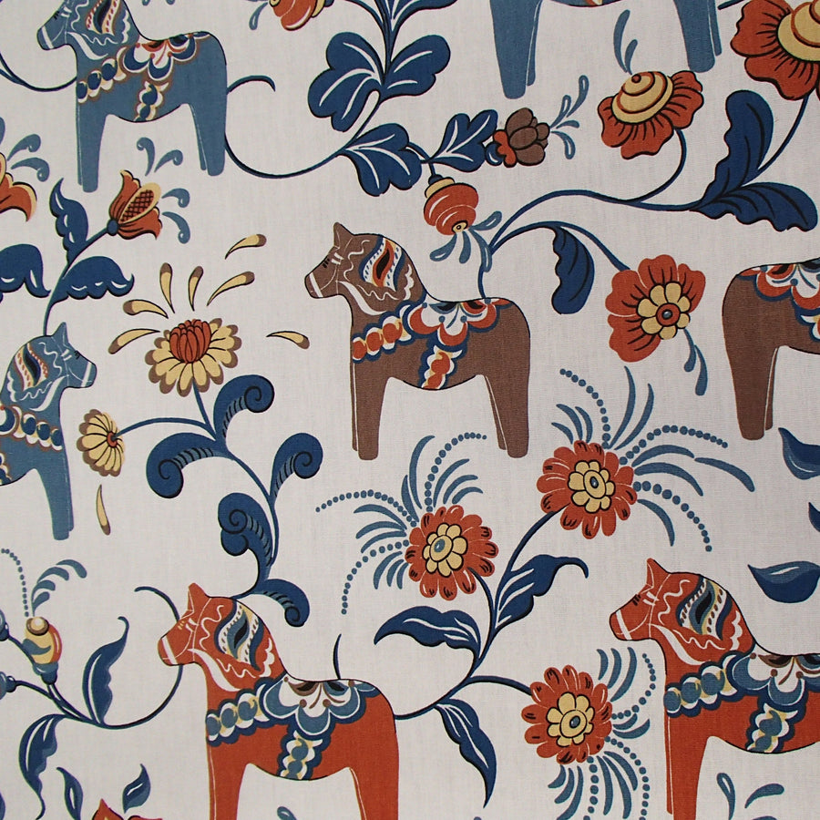 Swedish fabric - White w/ Blue, Red & Tan Dala horses & kurbits