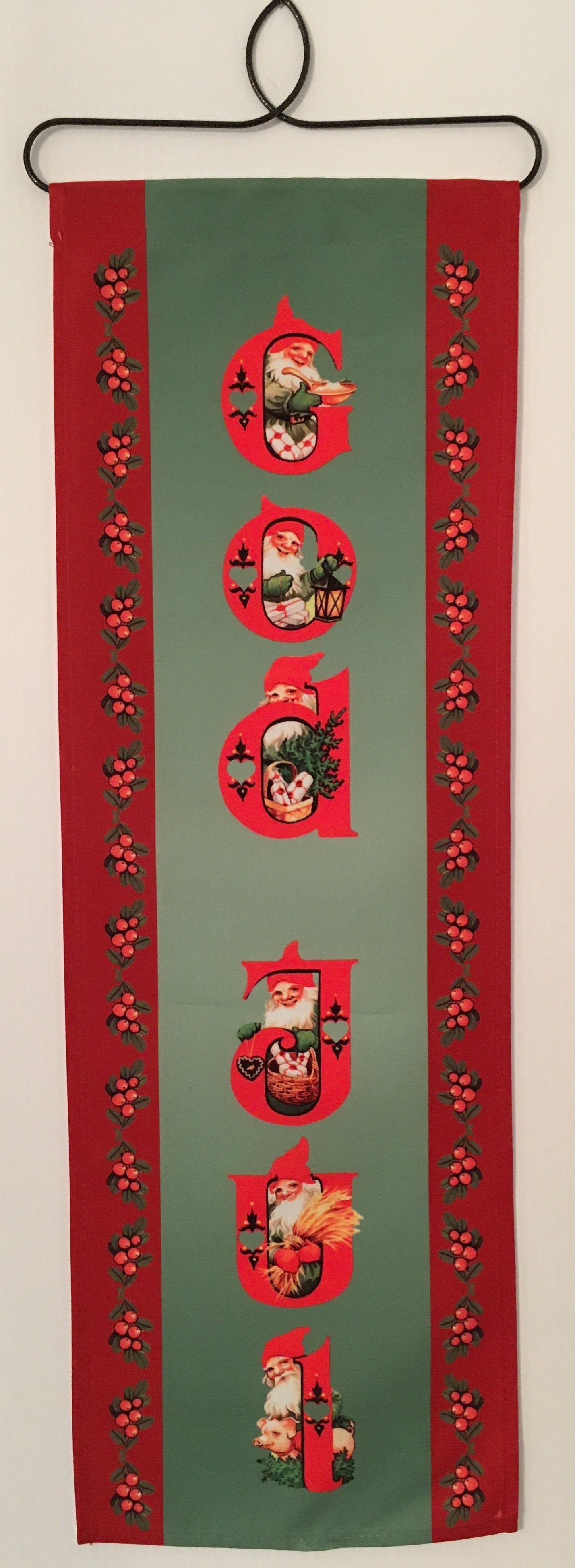 Polyester cloth wall hanging approximately 25" x 9" with wire hanger.