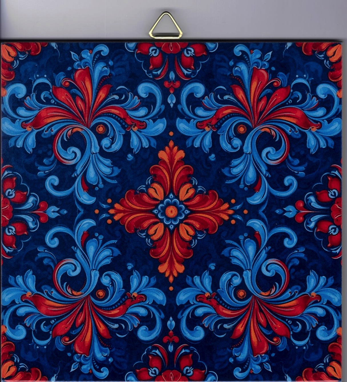 6" Ceramic tile, with a full cork backing, and triangle brass hanger.