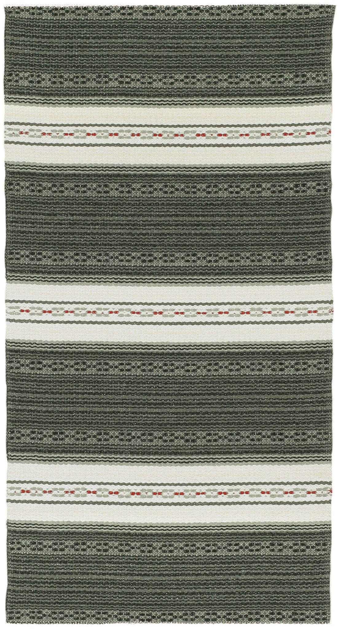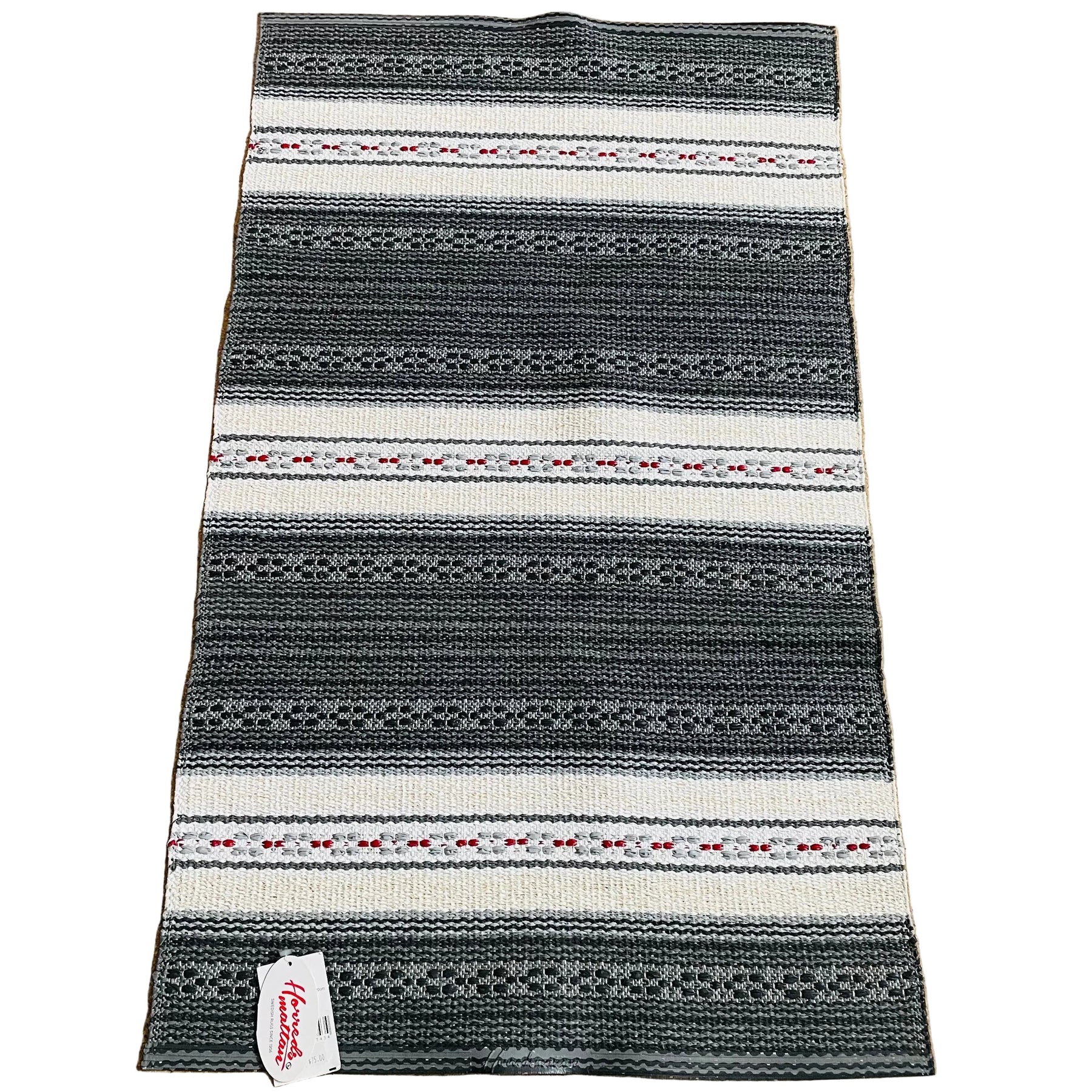 Woven carpet is vinyl with polyester warp. Size is 27" x 47" (70cm x 120 cm). Made by Horreds Mattan in Sweden.