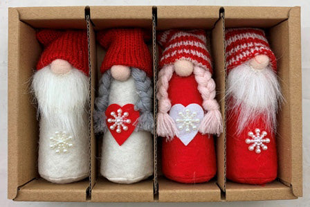 Box of ornaments with 4 gnomes - 2 boys & 2 girls. Made with knit hats, felt bodies with stuffing inside, fabric nose, yarn hair, fuzzy white beard & plastic snowflakes. They have a string loop for hanging. They measure 4" high and 1 1/4" wide.